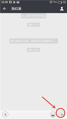 3.点击进入聊天页面后,点开对话栏右下方的“+”号;