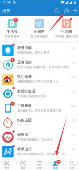2、接下来在支付宝页面中,选择箭头所指处的“朋友”,然后在页面右上方选择红色箭头所指处,点击进入。